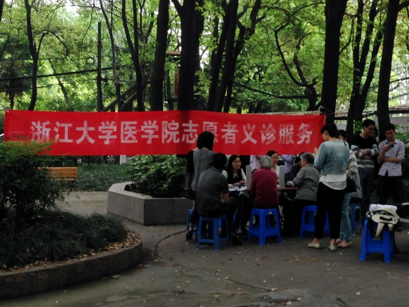 本次活动的志愿者分作两支小队。第一队志愿者向社区工作人员劳姐姐借了三张方桌,十来个凳子,拉起横幅,在社区的林间活动区架起了场子,就开始热情地招呼周围的老人们。3位志愿者准备好血压计、听诊器,专注地给爷爷奶奶们测量血压,其他志愿者则热情地和爷爷奶奶们拉家常,谈保健知识,尝试着用他们的知识带给老人们帮助和温暖。